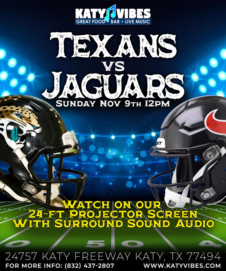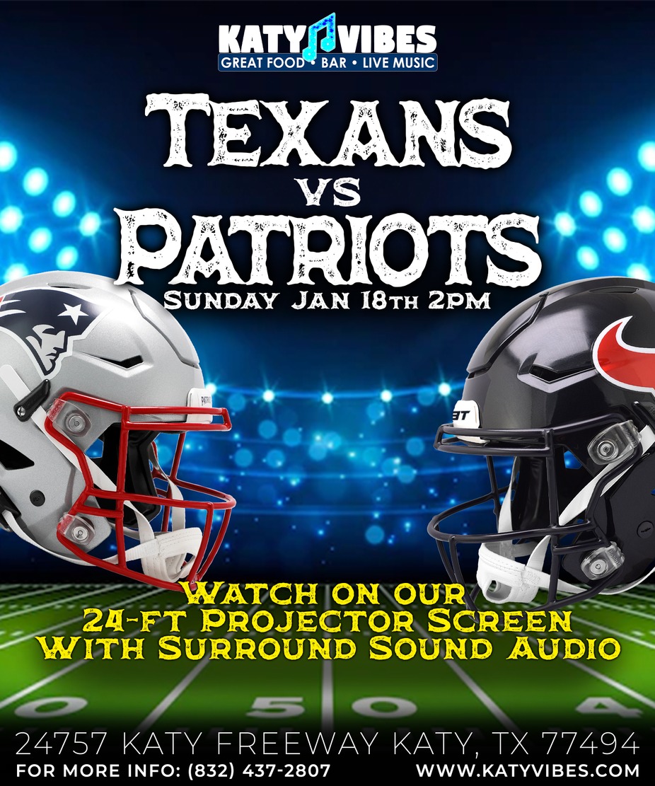 🏈 Texans vs Patriots hits Katy Vibes on Sunday, Jan 18th at 2:00 PM—show up early, loud, with your crew. 🔥