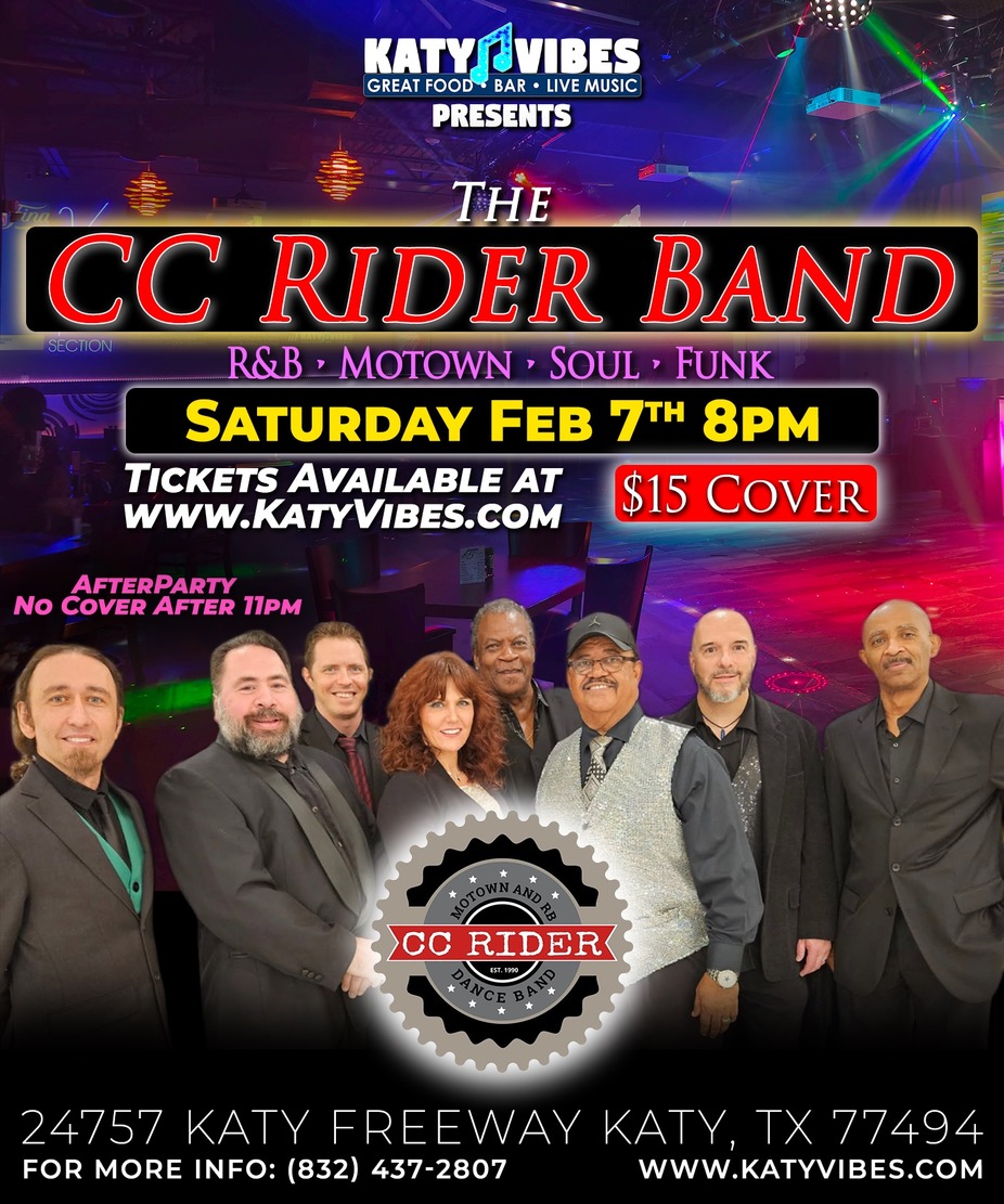 🔥Saturday, 2/7 at 8:00 PM, CC Rider Band brings live Motown, R&B, soul, and funk to Katy Vibes.🎶