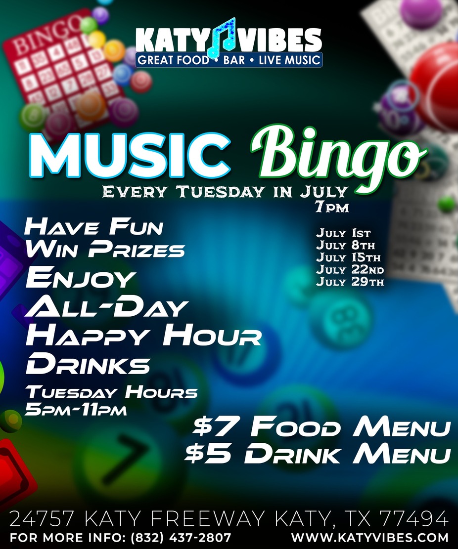 🎵 Every Tuesday in December at 7 PM, Music Bingo energizes Katy Vibes—save dates: December 2, 9, 16, 30. 🎉