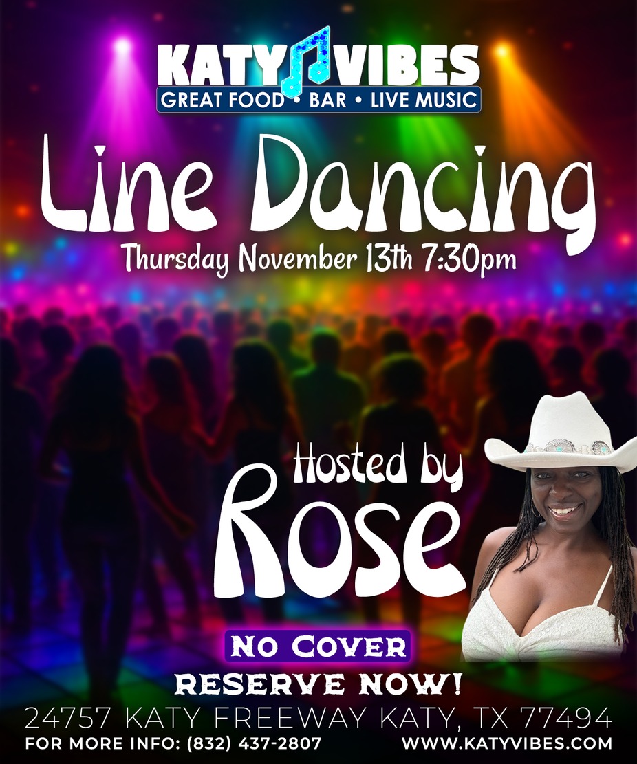 🔥 Thursday January eighth and Thursday January twenty-ninth at seven-thirty, Gloria leads electric line dancing nights at Katy Vibes. 🎉