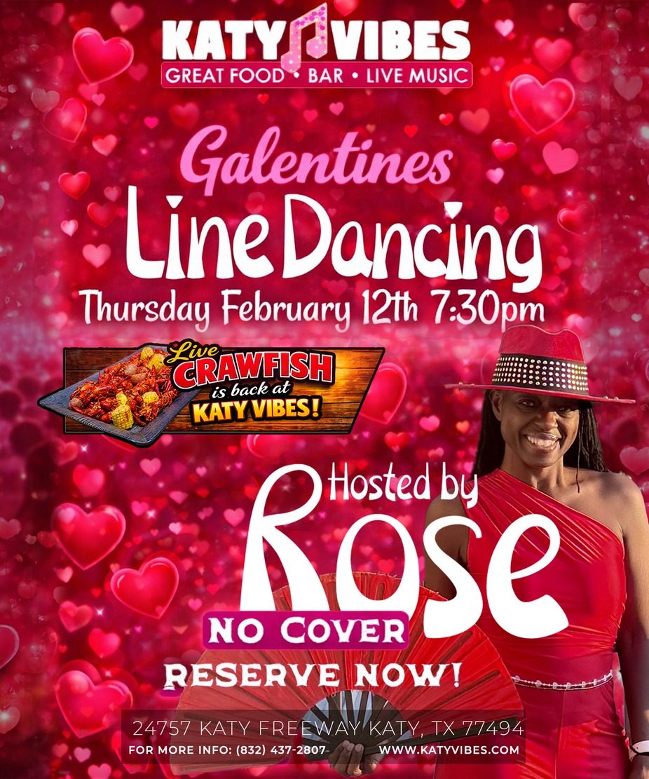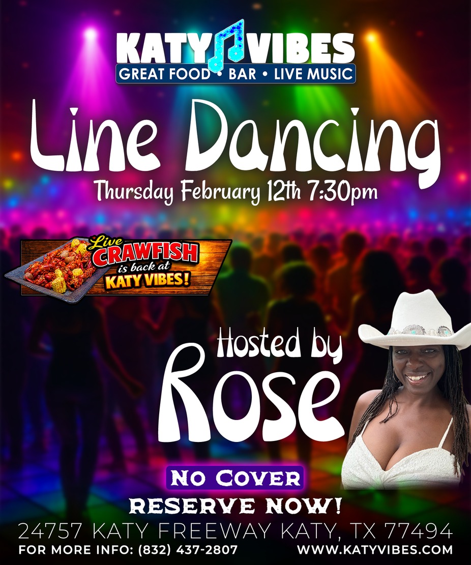 💃 Line Dancing is back Thursday, Feb 5th and Feb 26th at 7:30 PM at Katy Vibes—no cover tonight! ✨