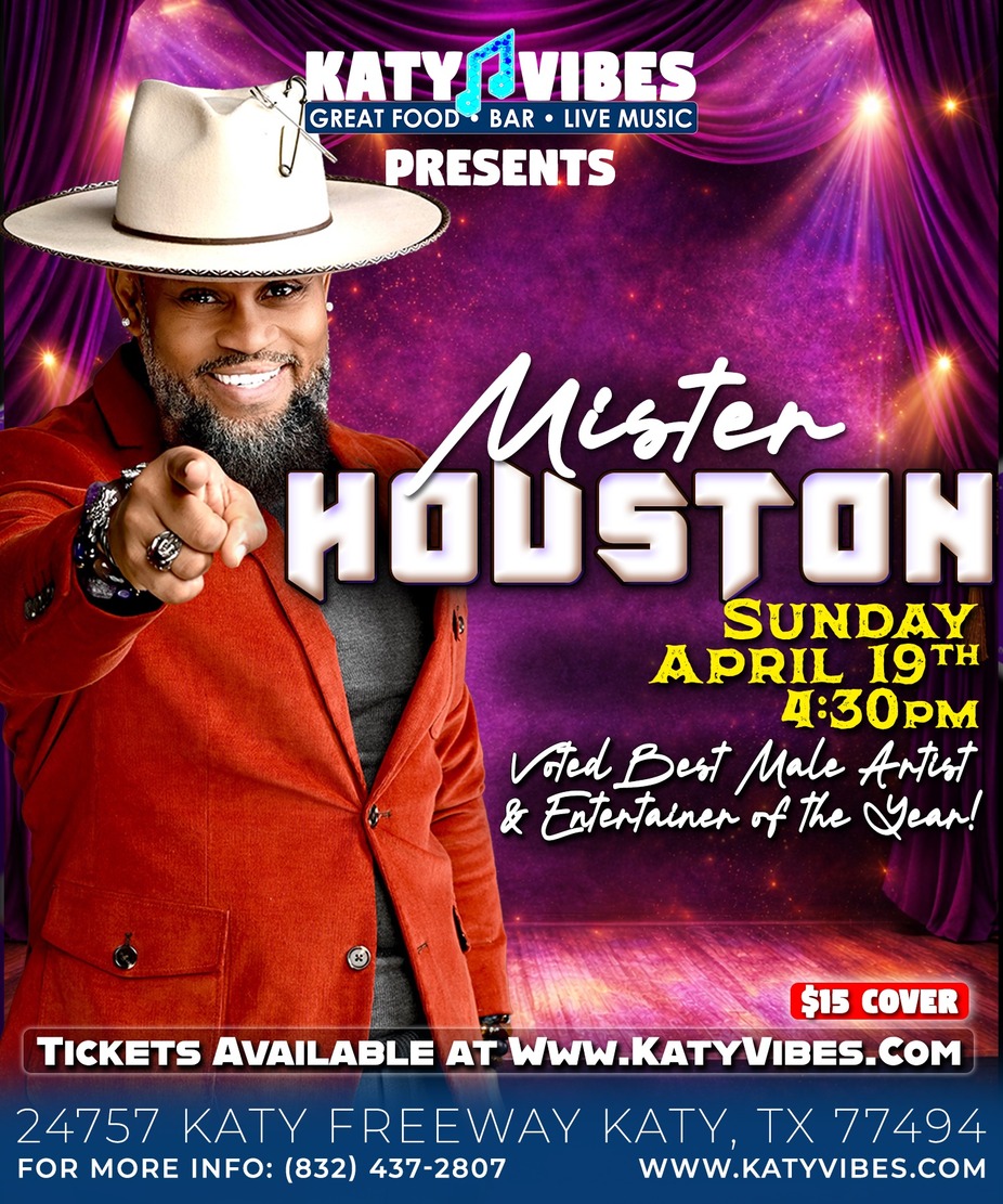 🎤 On Sunday, April 19 at 4:30 PM, Mister Houston brings his award-winning presence to the Katy Vibes stage. ✨